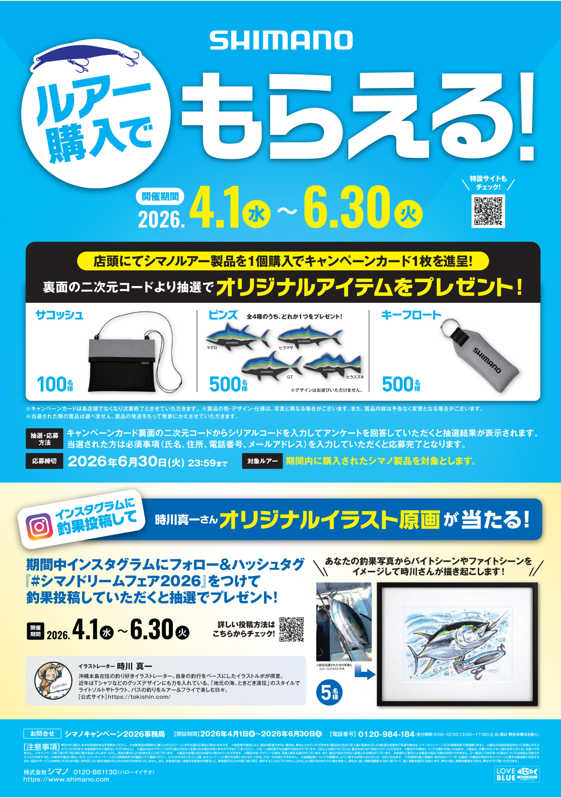 期間中、店頭にてルアーを1個購入すると、抽選でシマノオリジナルアイテムが当たりますよ!さらに、期間中インスタグラムにフォロー&ハッシュタグ#シマノドリームフェア2026』をつけて釣果投稿していただくと抽選で、時川真一さんのオリジナル原画が当たるプレゼントも実施中!